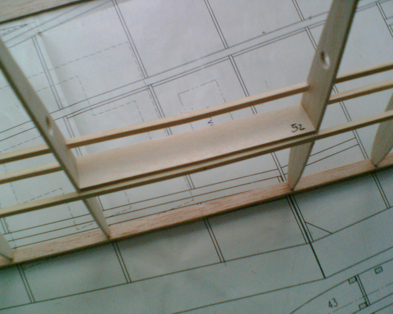 Vorher hatte ich versucht, die Teile quer anzuordnen und über den Spanten stumpf aneinander zu kleben, das ist nicht gelungen.