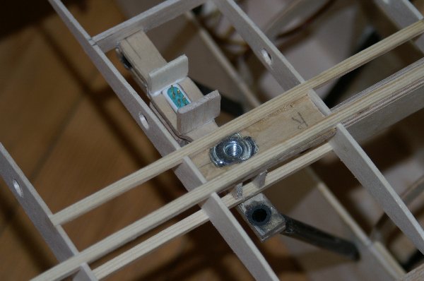 Flächen-Befestigung: Schrauben von unten, Einpress-Muttern im Flügel eingeklebt. Modifikation der Kraftaufnahme bei den Streben.