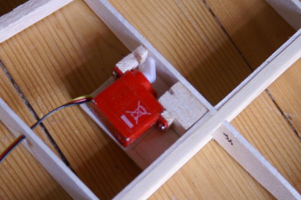 Querruder-Servos: Servoträger aus Balsa+Kiefer angefertigt. Servo von der "falschen" Seite geschraubt, zusätzlich mit doppelseitigem Klebeband fixiert.