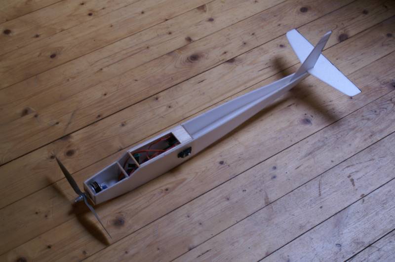 Der kastenförmige Rumpf und die aus Profilbrettern aufgebauten Tragflächen (alles aus Balsa)
