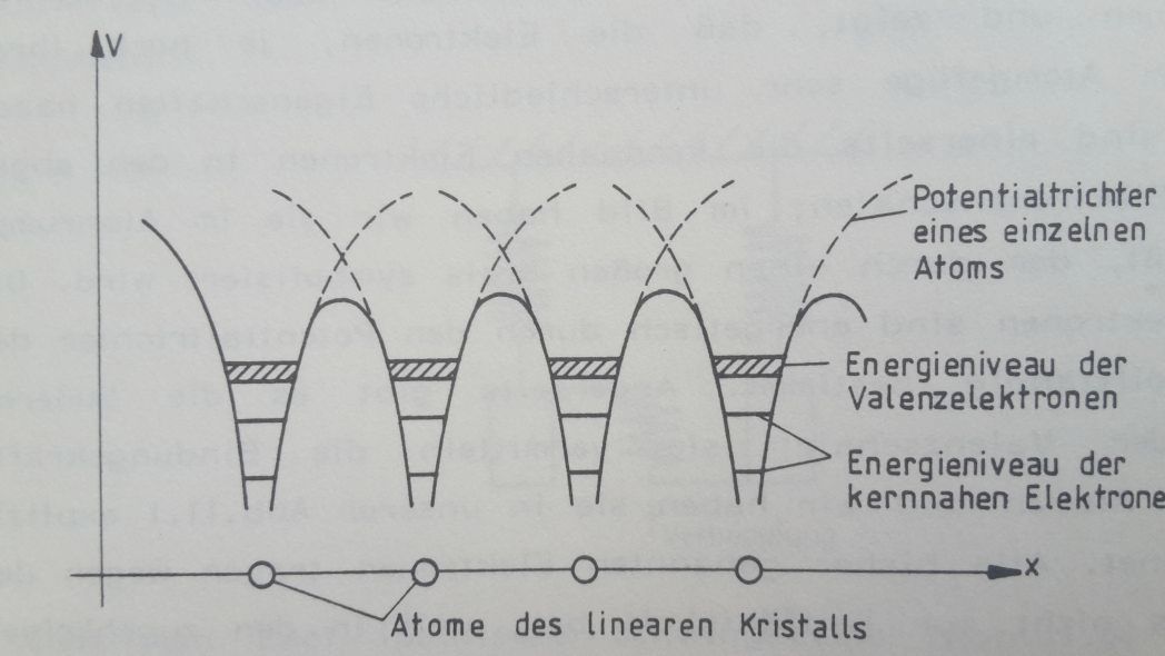 Das Potential, das in die Schrödingergleichung einzugeben ist, weist eine periodische Abfolge von Bergen und Tälern auf (siehe Bild). Die Potential-Berge können von Elektonen durchtunnelt werden.